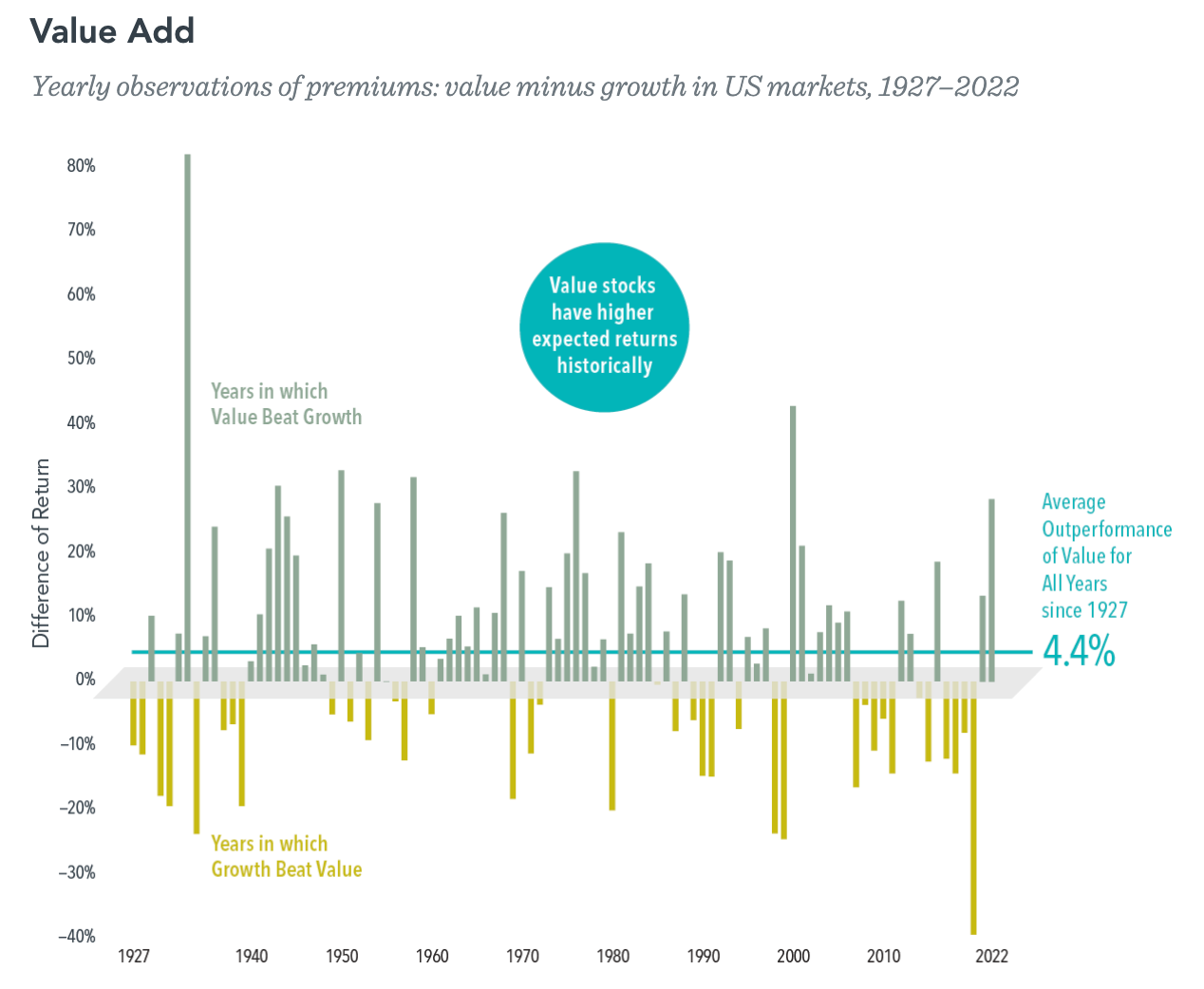 Value stocks (those with lower price-to-book or earnings ratios) have outperformed growth stocks by roughly 4.4% per year since 1927. As we’ve seen lately, there can be multi-year periods when this doesn’t happen – investing will always be a somewhat unpredictable social science – but it tends to be true more often than not.