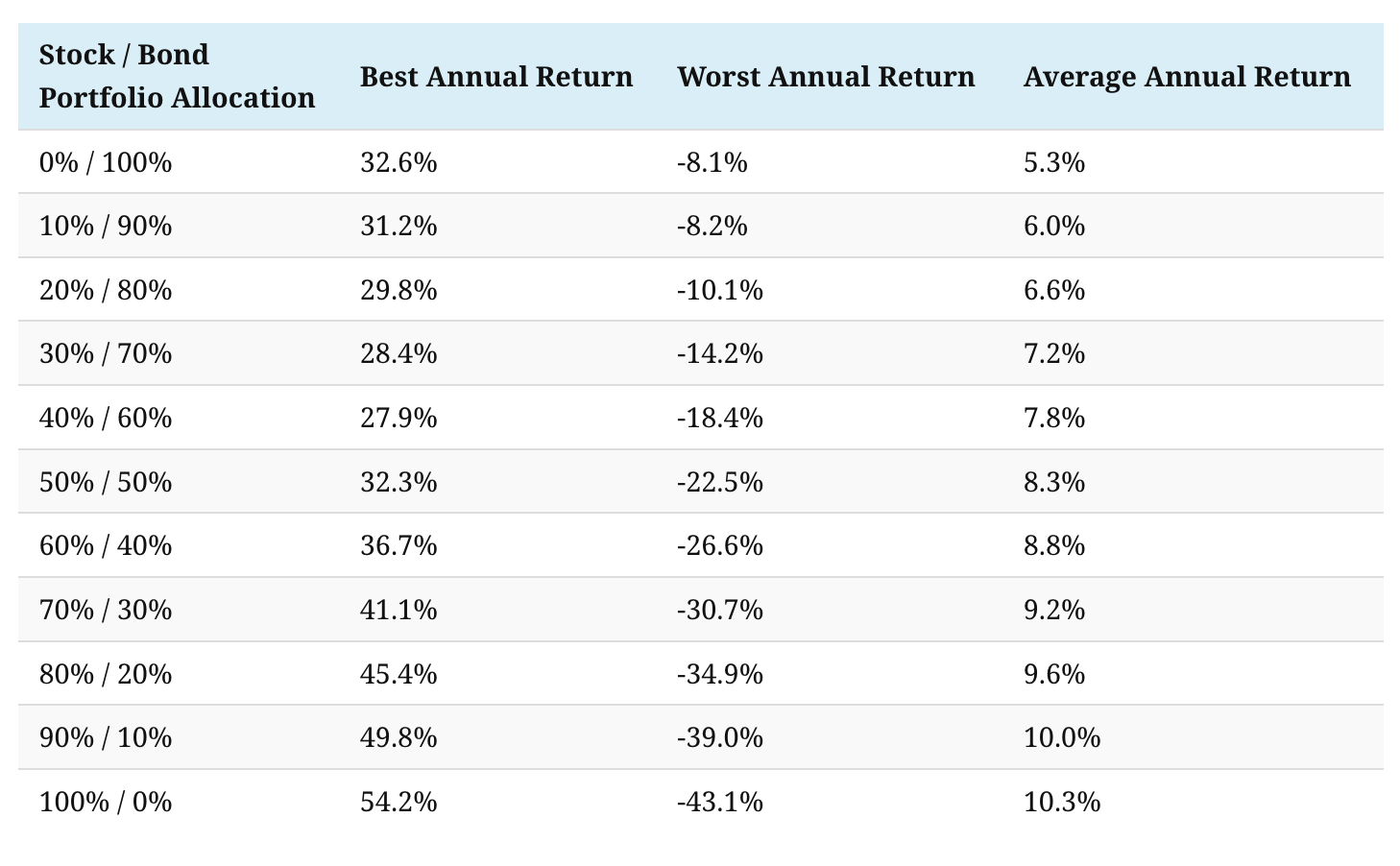 - Use asset allocation to match reality. Historical data from 1926 to 2019 shows that portfolios with higher stock allocations deliver higher average returns — up to 10.3% annually for 100% stocks — but also experience much steeper drawdowns, with worst-year losses reaching -43.1%. More balanced portfolios, like 60/40 or 50/50, offered solid long-term returns (8.8% and 8.3%, respectively) while cutting worst-case losses nearly in half.