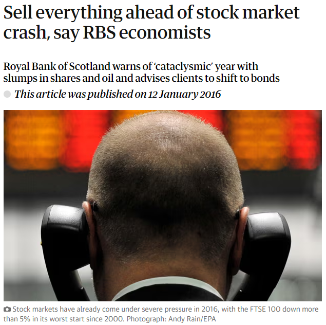 At the start of 2016, RBS advised clients to sell nearly all risk assets, warning that global markets were facing a potentially “cataclysmic” year and there will be a 20% drop in global stock markets and oil prices falling to $16 per barrel.