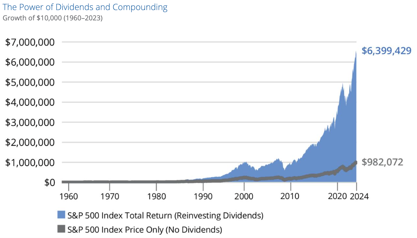 Dividend-paying stocks have also delivered strong results: from 1960 to 2023, $10,000 invested in the S&P 500 grew to over $6.39 million when dividends were reinvested — compared to just $982,000 without dividends.