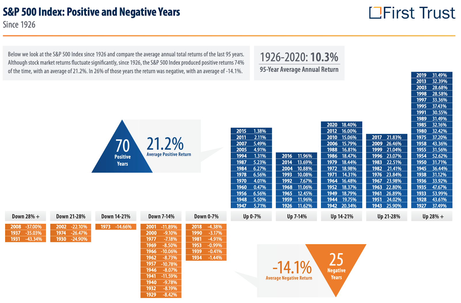 Large-cap stocks like those in the S&P 500 have not only earned ~10% long-term but finished positive in ~70% of years — compounding reliably above inflation.