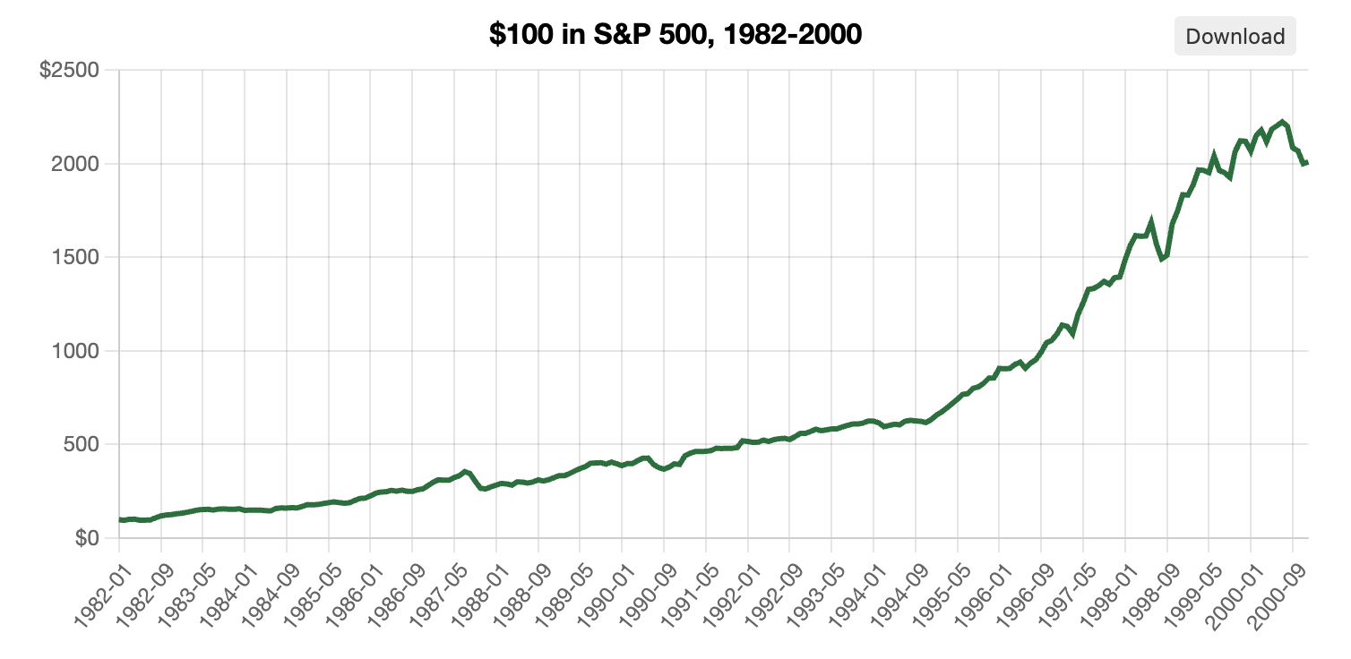 What actually followed was a two-decade bull market beginning in 1982, with the S&P 500 increasing by approximately 28-fold in price, with total returns — including dividends — exceeding 7,000% — one of the strongest runs in history.
