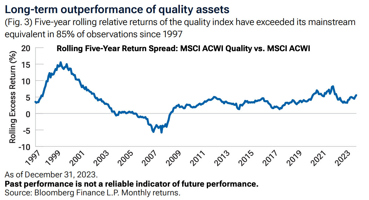 High-quality companies — profitable, low-debt, stable — have outperformed the market in every 10-year rolling period since 1998, and beaten growth stocks in about 85% of those periods.